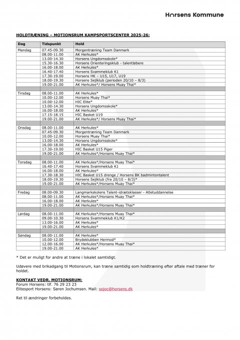 Eliteidrætsklubberne indskrevet i Horsens Kommunes Team Danmark aftale, har mulighed for at booke holdtider til styrketræning.